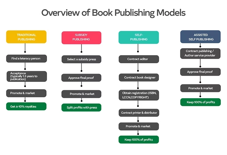 Vanity Publishing: Authors pay a publisher to produce and distribute their book, often without the same level of editorial support or marketing efforts found in traditional publishing.